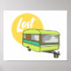 A summer themed illustration of a vintage caravan under a huge orange sun. The word lost is written on the sun.