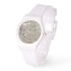 I only have one complaint. I ordered the watch with clear case and strap, and what was sent was white case and strap. I'm going to keep it because 1) it looks very nice in white, and 2) it would take too long to get a replacement made and sent in time for my occasion. Aside from the mix up with the color, the watch does look very good in white. The purple dial is actually sparkly which did not show in the online images. That was a nice surprise. If you like Swatch watches this is very similar to those. It's 33.6mm in diameter, 10.5mm thick, and 40.6mm lug to lug. Stainless steel case back says 3ATM/30m WR, so no swimming or showering or submerging this one. If you like Woodstock, this is a great choice.