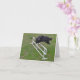 This card is a photograph of a border collie jumping a hurdle.
