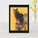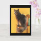 Black cat is sitting on table filled with cones of yarn, background is orange/tan with black border. Personalize greeting inside from "May your day be warm and cozy" - "Happy Birthday!" to your own text.