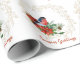 This pattern features a Cardinal and a delicate gold colored wreath. On the bottom of the wreath the are poinsettias and evergreen branch. Below the wreath are the words Seasons Greetings.