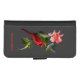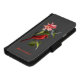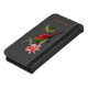 Easily personalized text is featured on this wallet style phone case along with a graphic illustration featuring a red male cardinal perched upon a branch with green ivy leaves and a green hummingbird hovering near a lovely pink lily. The gray background color may be customized to suit your style.
