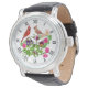 Original fine art design of male and female Cardinal birds in garden flowers by artist / designer Carolyn McFann of Two Purring Cats Studio printed on a quality and customizable watch for wild bird fans.