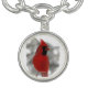 This charm bracelet features a brilliant red cardinal. He is truly the king of backyard birds! Here he is perched on a snowy rail eating black oil sunflower seeds while the winter snow swirls around him.