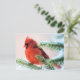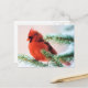 A vibrantly red male cardinal sits fluffed against the cold on a fir branch delightfully dusted by snow. Ideal for any bird or nature lover for the winter holiday season!