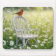 A red cardinal perches elegantly on a wicker chair surrounded by a field of daisies