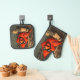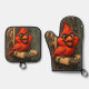An oven mitt, pot holder set featuring a caricature of a Cardinal.