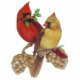 Richly detailed Cardinal birds resting on pine branch with cones and red Cardinal has holly twig.
