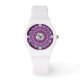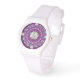 I only have one complaint. I ordered the watch with clear case and strap, and what was sent was white case and strap. I'm going to keep it because 1) it looks very nice in white, and 2) it would take too long to get a replacement made and sent in time for my occasion. Aside from the mix up with the color, the watch does look very good in white. The purple dial is actually sparkly which did not show in the online images. That was a nice surprise. If you like Swatch watches this is very similar to those. It's 33.6mm in diameter, 10.5mm thick, and 40.6mm lug to lug. Stainless steel case back says 3ATM/30m WR, so no swimming or showering or submerging this one. If you like Woodstock, this is a great choice.