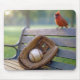 A baseball sits in a glove on a park bench, while a vibrant red cardinal watches nearby, capturing the essence of summer's simple pleasures