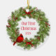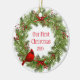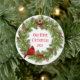 This ceramic ornament is shown with a festive Christmas holiday berry wreath and cardinal bird print.