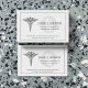 A minimal and Cardiologist business card featuring a medical caduceus symbol on a simple black, and white one-sided card. In the backdrop is a faded heart symbol to signify the field.