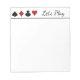 This notepad has a graphic of spades, diamonds, clubs and hearts with text that says "Let's Play" Great for poker, canasta, bridge, gin rummy, and all other card games