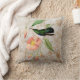 Square throw pillow design features a vintage illustration of the Green-throated Carib hummingbird (Eulampis holosericeus.) A bright green and blue hummingbird perches on a tropical mandevilla vine with pink flowers, on an off-white vintage grunge background with gold swirls and floral silhouettes.