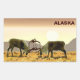 Two caribou bulls wrestle during the fall rut in the far north while the sun sets in the background. Text reading "ALASKA" also appears.