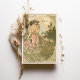 This enchanting Art Nouveau-inspired wedding menu card is adorned with the delicate illustration of a floral goddess surrounded by lush carnations. Rendered in a warm palette of blush pink, soft green, and muted beige, this card evokes a sense of vintage elegance and romance. The graceful art style, reminiscent of Alphonse Mucha's work, captures the beauty of nature with intricate detailing in both the floral elements and the goddess's flowing attire. Perfect for an elegant wedding or vintage-themed event, this menu card offers a timeless aesthetic that will add a touch of sophistication to any table setting. Customize it with your unique menu details to impress your guests with both style and substance.