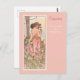 A fine art postcard with the vintage illustration by Alphonse Mucha from The Flower Series, Carnation (1898), which has been digitally restored and enhanced. A portrait of a woman in a pink gown surrounded by a field of pink and white carnations.