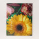 Botanical themed jigsaw puzzle featuring a photo of colorful bunch of flowers: yellow gerbera and striped white red carnations symbolizing devotion, love and fascination. Glamorous optimistic design. Unusual gift for any special occasion. You can delete the text "It's going to be sunny" or replace it with your own message (click "Personalize this template").