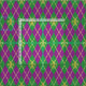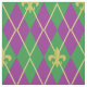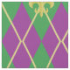 A harlequin pattern of green and purple is transformed into a playful argyle with an overlay of gold diamond outlines and fleur de lis, creating a fun and colorful pattern perfect for any New Orleans influenced Mardi Gras celebration.