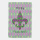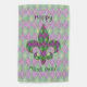 A harlequin pattern of green and purple is transformed into a playful argyle with an overlay of gold diamond outlines and fleur de lis, creating a fun and colorful pattern perfect for any New Orleans influenced Mardi Gras celebration. The pattern is masked behind the silhouette of a fleur de lis to add a fun final note. Customize the message on the front and back of this flag to create a holiday decoration perfect for your tastes.