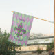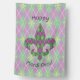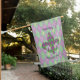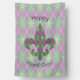 A harlequin pattern of green and purple is transformed into a playful argyle with an overlay of gold diamond outlines and fleur de lis, creating a fun and colorful pattern perfect for any New Orleans influenced Mardi Gras celebration. The pattern is masked behind the silhouette of a fleur de lis to add a fun final note. Customize the message on the front and back of this flag to create a holiday decoration perfect for your tastes.