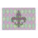A harlequin pattern of green and purple is transformed into a playful argyle with an overlay of gold diamond outlines and fleur de lis, creating a fun and colorful pattern perfect for any New Orleans influenced Mardi Gras celebration. On the back a faded version of the argyle sits behind a patterned fleur de lis to give you multiple options for your table.