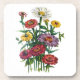 Old-fashioned botanical illustration of zinnia flowers in red, yellow purple and white