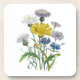 Old-fashioned botanical illustration of cornflowers in blue, yellow and white.