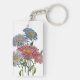 Old-fashioned botanical illustration of China asters in pink, white and blue.