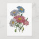 Old-fashioned botanical illustration of China asters in pink, white and blue.