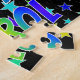 This lively and fun birthday-themed jigsaw puzzle design features the message "HAPPY BIRTHDAY, CAROL" with the characters having a colorful rainbow spectrum inspired gradient pattern, in addition to an exciting field of stars background pattern. A vibrant puzzle like this might be a fun way to send a birthday greeting message to somebody named Carol. [~Z0000468]