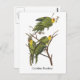 This is of a group of four Carolina Parakeets sitting on a branch. There are three males and one female. The female is all green while the males have bright yellow heads with red around and between their eyes.