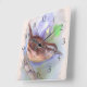 This wall clock features a Carolina wren perching on a branch with summer blooming morning glories in the background created in soft pastel hues. The numbers of the clock face may have their color edited to change from the dark gray.