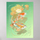 Poster with two carp koi in water lily pond illustration. Green, yellow, orange and gold colors.