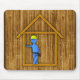 For any handyman, construction worker, or carpenter. Illustrated cartoon construction worker with hard hat and tool belt inside the frame for a house.