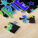 This lively and exciting birthday-themed jigsaw puzzle design has the message "HAPPY BIRTHDAY, CARRIE" with the characters having a colorful rainbow spectrum inspired gradient pattern, in addition to a fun star shapes background pattern. A colorful puzzle like this might be used to send birthday wishes to somebody named Carrie. [~Z0000468]