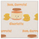 Fabric with a smiling jar of carrot baby food. This cartoon illustration includes stacks of sliced carrots. The design includes a customizable name and the words “Yum, Carrots!”