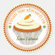 A kitchen label featuring an illustration of a carrot cupcake with white icing inside a decorative orange and white circle with orange text "From The Kitchen Of" Personalize with your name.