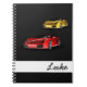 Notebook shown with a black background and with fancy fast cars. Custom Name,customize this item and change the name to yours or even take off the name if you wish and add other text.
