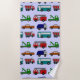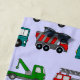 This beach towel has a novelty design of trucks and buses in red, blue, green, and brown on a field of light blue.