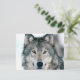 Jolie carte postale avec loup gris avec fourrure épaisse en hiver avec la neige.
