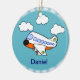 Adorable cartoon airplane flying through the blue skies and clouds. On a sunburst background in blue