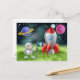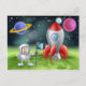 An illustration of an outer space cartoon background with a cute cartoon astronaut planting an earth flag on an alien world with his shiny vintage rocket