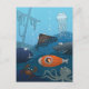 This cute Postcard, designed in blue tones, features brave kid exploring underwater life from the window of his submarine. He travels among the corals and ship wrecks watching various undersea animals such as an octopus, shark, crab, jellyfish. Great card for the boy who's interested in underwater marine world.