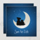 Announce your engagement / wedding in an unconventional way with this cute Save The Date card with cartoon illustration of cat and dog silhouettes sitting together on the moon and looking at the stars.