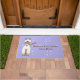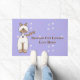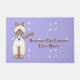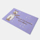 Lavender kitty lover's door mat, with a white and pink dot pattern. Cartoon graphics of a Siamese cat, decorates the left side of the mat, with brown custom text on the right side. Personalize the text to read what you want.