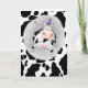 Springy Happy Birthday Cartoon Cow on cow print card front bouncing by to wish you an "Udder-ly" Amazing Birthday!