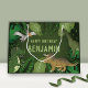Destei's original cute cartoon illustration of different kind of dinosaurs together with some green jungle plant foliage. The dinosaurs included are Tyrannosaurus / T-rex, Triceratops, Pteranodon and Brachiosaurus. The background color is green. There are also two personalizable text areas.