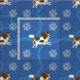 Cartoon style Papillon leaping against a background of blue with paw prints and tracks in gray, pink and blue.