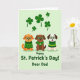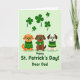 This greeting card shows three cartoon dogs grouped closely together on a pale green background, their heads gently angled toward one another as if sharing a friendly moment 💚. One pup is warm orange in a ribbed green sweater with three small shamrocks, the second is rich brown with a green bandana marked by a single clover, and the third is white in a striped sweater of green and lime. Each dog wears oversized round green glasses, and their bright eyes and wide smiles give the scene a cozy, affectionate energy, like pals posing for a photo. Near the top, several deep green shamrocks float above them, scattered like confetti for St. Patrick’s Day ☘️. Centered beneath the dogs, the phrase “Happy St. Patrick’s Day!” appears in dark green lettering, with “Dear Dad,” placed just below it in the same color. The greens stay soft and varied across the page, keeping the holiday look consistent while letting the different fur tones stand out. The final detail is the cluster of shamrocks drifting overhead against the light green backdrop.